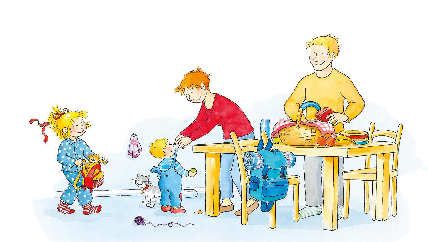 На кухне мама с папой уже упаковали всё для пикника. Сразу после завтрака они отправятся в путь. Но прежде Конни должна умыться, почистить зубы и одеться.