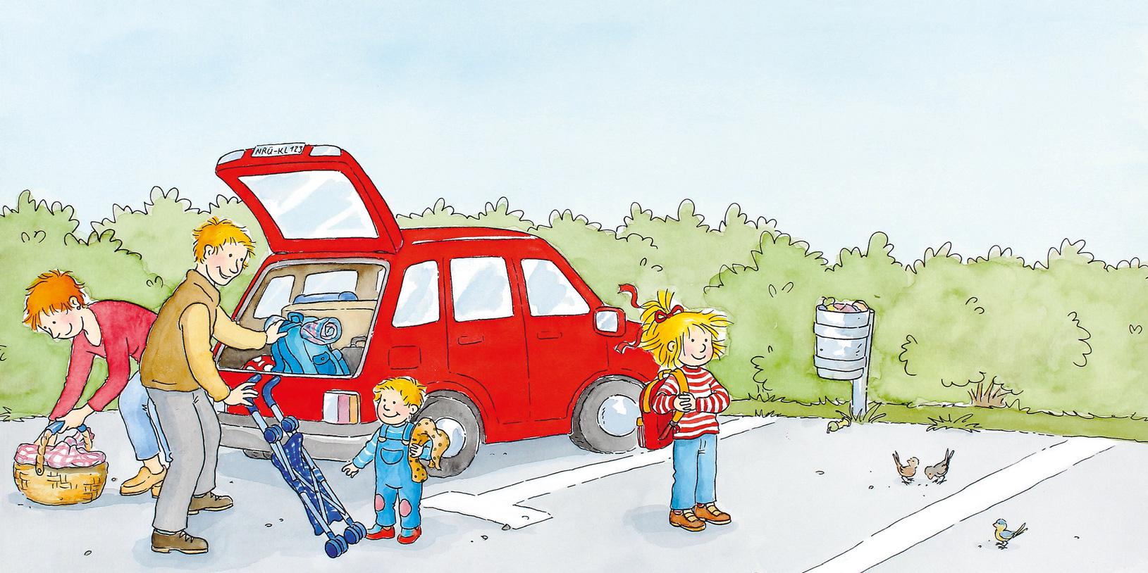 К счастью, до их любимого леса на машине ехать совсем недолго. Очень скоро папа сворачивает на небольшую парковку. Здесь они договорились встретиться с бабушкой, дедушкой и двоюродным братом Конни Михаэлем.