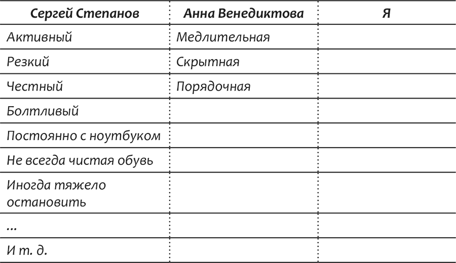 2) В верхней строке первых двух колонок впишите имена двух ваших знакомых. Заполняйте и выписывайте все характеристики, которые придут на ум.