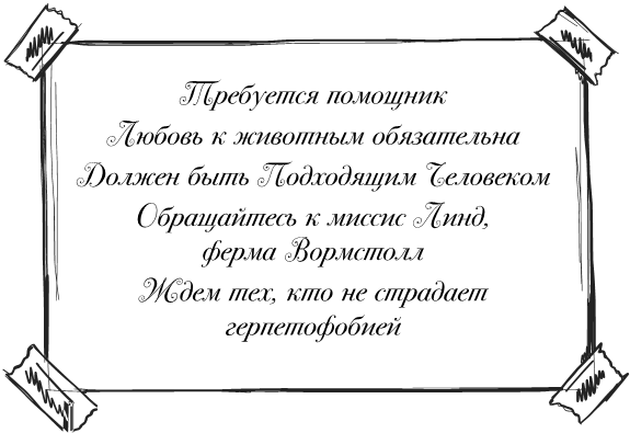 Над дверью Магазина Сладостей висела табличка «Лавка Филлинг & Дентчер: здесь вы получите все, что захотите». Поскольку у них есть высокие стеклянные банки со всеми сладостями, какие только можно вообразить, и они взвешивают их в маленьких бумажных пакетах, все называют эту лавочку просто Магазином Сладостей. Я пришел туда по заданию Фрэнк, чтобы купить чипсы с сыром и луком, когда заметил на окне объявление. Оно было написано зелеными чернилами замысловатым почерком с завитушками и зажато между рекламой подержанного тостера («Почти работает, выгодная покупка») и размытой фотографией жирного полосатого кота с белыми лапами («Вы видели Снаффи? Вознаграждение сто фунтов»):