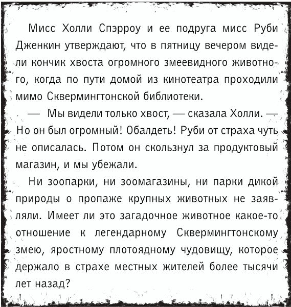 Событий в Сквермингтоне было немного. «Общественные туалеты закрыты на ремонт». И что? «Роскошный конкурс садового искусства». Скукота. «Пропадают домашние питомцы! Домашние питомцы в опасности! Полиция предупреждает владельцев домашних животных: не отпускайте их далеко от себя». Пусть попробуют подойти к Дракуле, мерзкому кусачему комочку шерсти, и чем раньше – тем лучше. «Обнаружена гигантская рептилия! Неужели Сквермингтонский Змей вернулся? Подробнее на странице 3…»