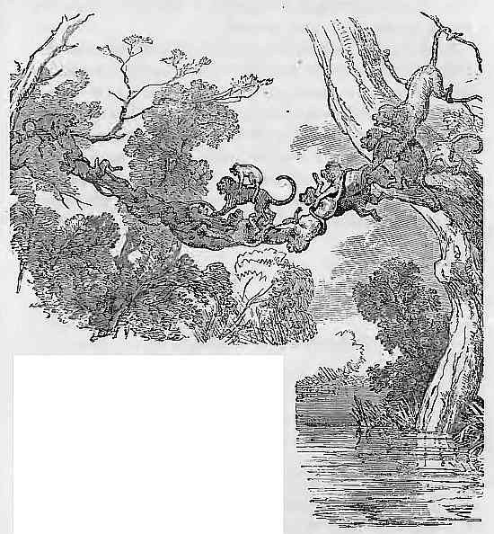 They had no need to keep watch in any other direction. Behind them, and on each side, extended the unbroken wall of tree-tops, shaded with llianas, worked and woven together into a network that appeared impenetrable even to the wild animals of the forest. Who would have looked for an enemy in human shape to come that way?
