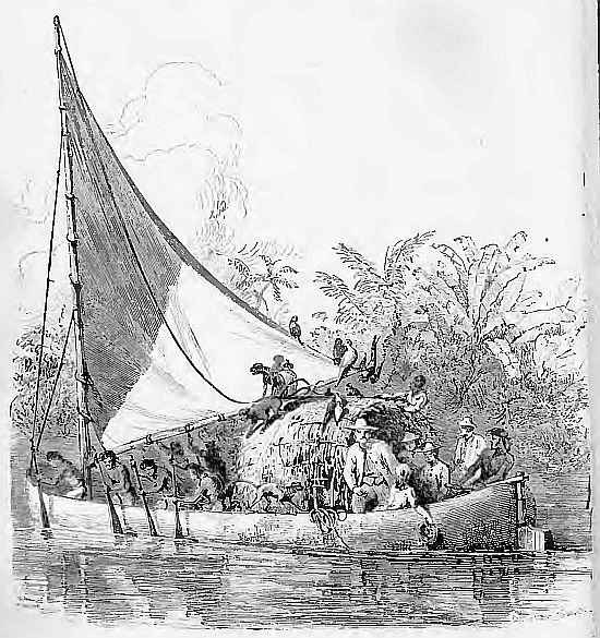 When we say of singular construction, we mean singular to one unaccustomed to the navigation of Amazonian waters. There the craft in question was too common to excite curiosity, since it was nothing more than a galatea, or large canoe, furnished with mast and sail, with a palm-thatched cabin, or toldo, rising over the quarter, a low-decked locker running from bow to midships,—along each side of which were to be seen, half seated, half standing, some half-dozen dark-skinned men, each plying, instead of an oar, a paddle-blade.