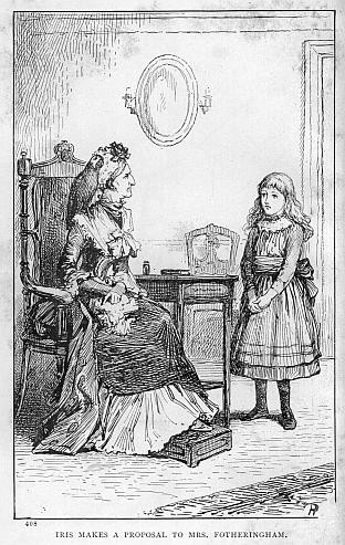 At this very moment, and just as he was turning to another tree, a little chuckling laugh fell on his ear. It was such a strange sound in the stillness of the garden, and it seemed so close to him, that he started violently and dropped his knife. Where did it come from? He looked vaguely up in the sky, and down on the earth—there was nothing living to be seen, not even a bird. “I must have been mistaken,” he thought, “but it’s very odd; I never heard anything more clearly in my life.” He picked up his knife, and moved further along the turf walk, a good deal disturbed and rather nervous. At the end of it there was a rustic sort of shed, which had once been an arbour, but was now only used for gardening tools, baskets, and rubbish: over the entrance hung a mass of white climbing roses. Walking slowly towards this, and cutting a rose or two on his way, Mr Vallance was soon again alarmed by the same noise—a low laugh of satisfaction; this time it came so distinctly from within the shed, that he quickened his pace at once and, holding back the dangling branches, looked in with a half feeling of dread. What he saw there so astonished him that he stood motionless for some moments, as though struck by some sight of horror. On the floor was a large wooden marketing basket, and in this, wrapped in an old shawl, lay a little child of two years old. She had bright yellow hair, and a brown skin, and in her fat hands she held a queer little shoe with brass nails in it and brass clasps; she was making small murmuring sounds to herself, and chuckling now and then in perfect contentment. Mr Vallance stared at her in great perplexity; here was a puzzling thing! Where did the child come from, and who had left it there? Whoever it was must come and take it away at once. He would go and tell Priscilla about it—she would know what to do. But just as he let the creepers fall back over the entrance a tiny voice issued from the basket.