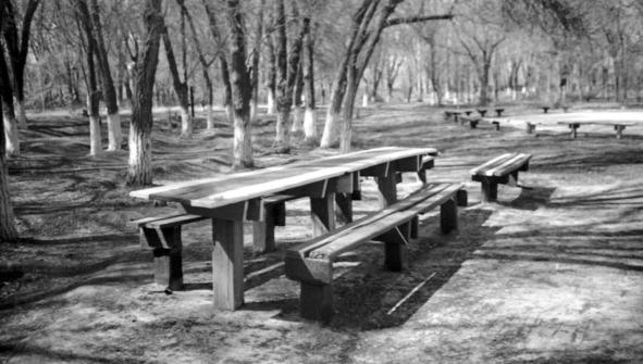 Парк 70-х. За этим столом заводчане играли в шахматы. Слева находился тир; справа — старая танцплощадка и пивная.