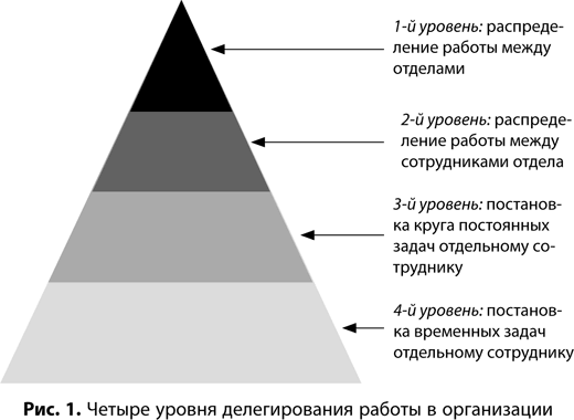 Развивая принцип скалярной цепи А. Файоля, мы понимаем под делегированием управленческий процесс, состоящий из четырех уровней. Таким образом, полный процесс делегирования работы напоминает пирамиду (рис. 1).