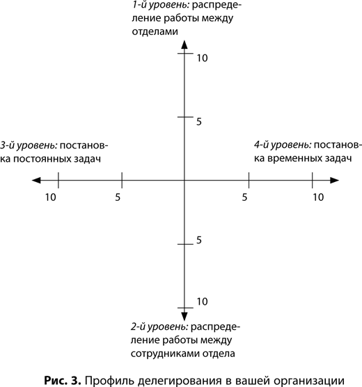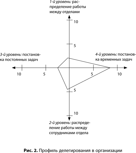 3. Подумайте, насколько эффективно в вашей организации развит каждый из четырех уровней делегирования. Оцените степень развития каждого из уровней по 10-балльной шкале. Для этого отметьте соответствующие точки на осях и соедините их отрезками. Вы получите профиль делегирования вашей организации (рис. 3).