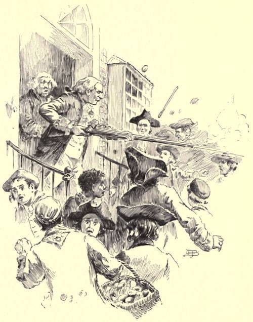 The soldiers fire Frontispiece "How long is it since you have been hobnobbing in that quarter?" 13 "They are indulging in treasonable practices" 19 Attaching the warning 27 "Will you give me the money now?" 35 "You are a coward!" 40 "Raising his musket quickly, and without taking aim, he fired" 45 Paul Revere and Amos 50 The crowd under the Liberty Tree 61 "The sentry knocked him down" 71 "One of the fragments struck Mrs. Richardson" 74 "Men and boys rushed from their homes" 85 Attucks 89 "To the main guard" 95 "Poor Sam!" 102 "Both regiments or none!" 107"Your Lordship must know that Liberty Tree is a large, old Elm in the High Street, upon which the effigies were hung in the time of the Stamp Act, and from whence the mobs at that time made their parades. It has since been adorned with an inscription, and has obtained the name of Liberty Tree, as the ground under it has that of Liberty Hall. In August last, just before the commencement of the present troubles, they erected a flagstaff, which went through the tree, and a good deal above the top of the tree. Upon this they hoist a flag as a signal for the Sons of Liberty, as they are called."