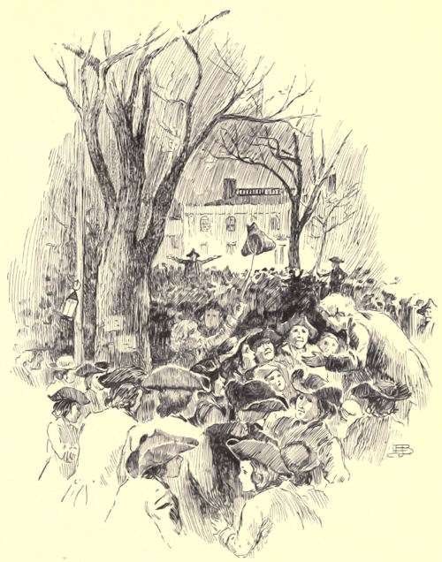 They had been among the throng who, in open defiance of the law, had made prisoner of Giles Hendricks; tarred and feathered, and then carried him in a cart through the principal streets of the city to the Liberty Tree, because he had given evidence regarding the smuggling of wine from Rhode Island. Here under the old elm he had been forced to swear he would never be guilty of a like crime in the future, and only then was allowed to go free, wearing his closely fitting and decidedly uncomfortable garment of tar.