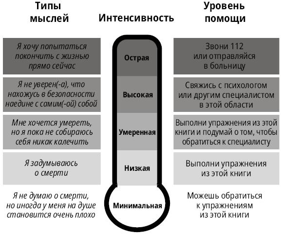 Независимо от интенсивности твоих мыслей и эмоций навыки, полученные при чтении этой книги, помогут тебе справляться с напряженными ситуациями, брать под контроль болезненные чувства и работать над улучшением отношений с другими. Если твои мысли часто достигают высокого или острого уровня, следующий раздел будет тебе особенно полезен. Мы начинаем именно с самых высоких уровней, потому что твои благополучие и безопасность являются главным приоритетом. Когда ты сталкиваешься с мыслями о самоубийстве, может казаться, что твои дела никогда не пойдут на поправку. На самом же деле все может стать лучше, просто для этого понадобится помощь. Позаботившись о своих безопасности и благополучии в тяжелый период жизни, ты даешь себе возможность узнать, как дальше будет развиваться твоя жизнь! При высокой или острой интенсивности суицидальных побуждений лучший способ помочь себе — это обратиться к профессионалам. К уровням более низкой интенсивности мы вернемся позже.