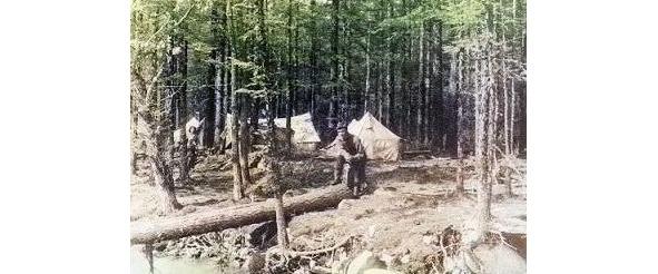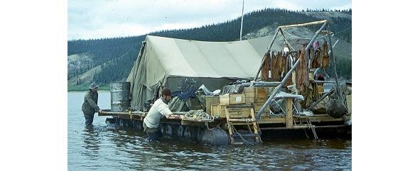 И одновременно к нам подплыл на плоту из бочек отряд Осташкина. Как только палатки были установлены — 15 минут и они стояли — жерди для них я возил с собой (даже в вертолете), вместо колышков — металлические пальцы от траков гусениц вездехода, и раскладушки, чтобы не терять время на изготовление нар.