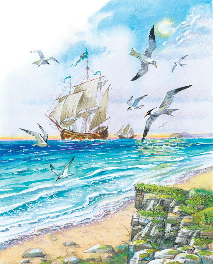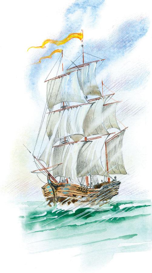 Вдруг я услышал крик Ксури: «Хозяин! Хозяин! Парус! Корабль!» Глупый мальчишка перепугался до смерти, вообразив, что это один из кораблей его хозяина, посланный за нами в погоню; но я знал, как далеко ушли мы от мавров, и был уверен, что нам не может угрожать эта опасность. Я выскочил из каюты и тотчас же не только увидел корабль, но даже определил, что он был португальский и направлялся, как я поначалу решил, к берегам Гвинеи. Но, присмотревшись, я убедился, что судно идёт в другом направлении и не думает сворачивать к земле. Тогда я поднял все паруса и повернул в открытое море, решившись сделать всё возможное, чтобы вступить с кораблём