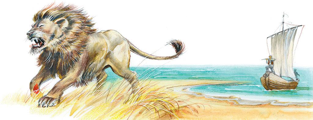 Ксури был страшно напуган, да, правду сказать, и я тоже. Но ещё больше мы испугались, когда услыхали, что одно из этих страшилищ плывёт к нашему баркасу; мы не видели его, но по тому, как оно отдувалось и фыркало, могли заключить, что это было свирепое животное чудовищных размеров. Ксури решил, что это лев, и крикнул, что надо поднять якорь и уйти отсюда.