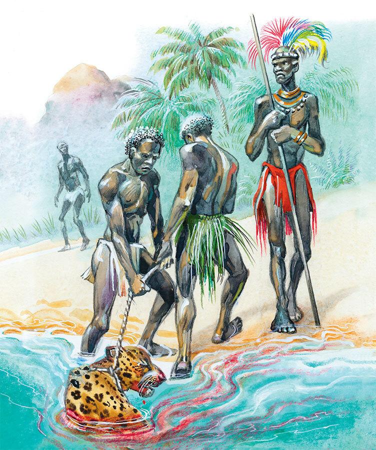 Невозможно передать, сколь поражены были бедные дикари, когда услышали треск и увидали огонь ружейного выстрела; некоторые из них едва не умерли со страху и упали на землю. Но, видя, что зверь пошёл ко дну и что я делаю им знаки подойти ближе, они ободрились и вошли в воду, чтобы вытащить убитого зверя. Животное оказалось леопардом редкой породы с пятнистой шкурой необычайной красоты. Негры, стоя над ним, воздевали вверх руки в знак изумления; они не могли понять, чем я его убил.