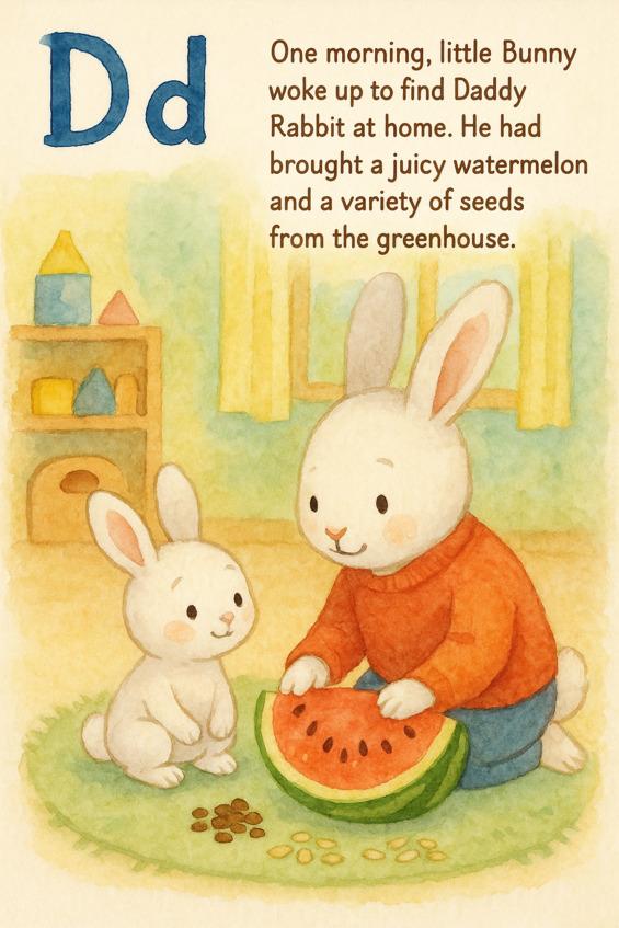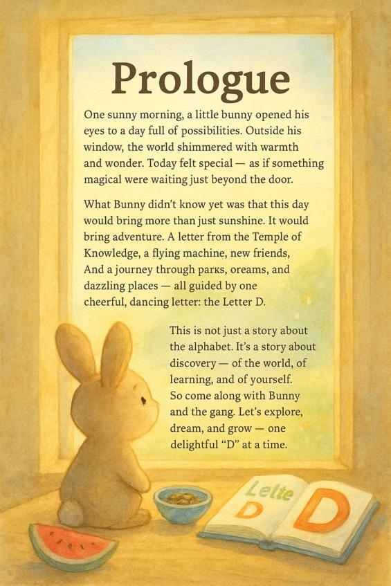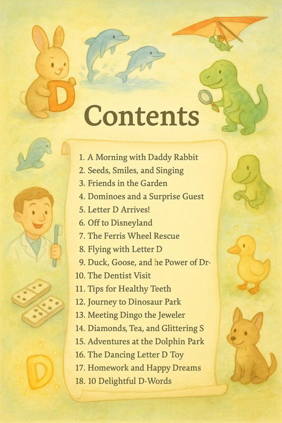 In this bright and educational tale, Little Bunny and his friends set off on a magical journey with the lively Letter D. Along the way, they enjoy fun games, learn about health, visit a kind dentist, meet Dingo the dinosaur jeweler, and have exciting adventures at a dolphin park. The children discover the importance of dental care, how to overcome fear, dream big, and strive for knowledge. They also go hang gliding, play dominoes, visit Disneyland, and receive a singing, dancing D-shaped toy.