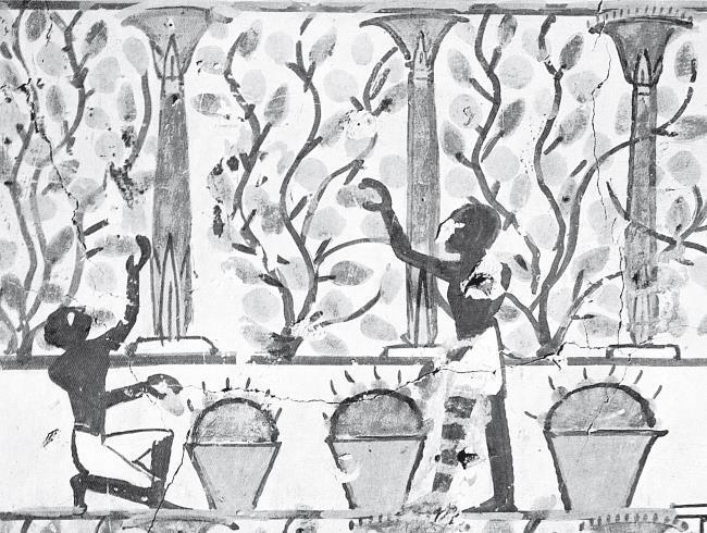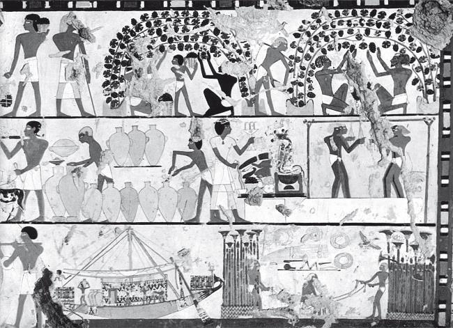 Виноградники с работающими там людьми, а также разные стадии производства вина можно найти и в древнеегипетской живописи. А в переписи 1000 года до н. э. перечислено 513 принадлежащих храмам виноградников. Большинство из них были расположены в дельте Нила, но некоторые находились в оазисах дальше на юге. Виноград выращивали на шпалерах или на деревьях, а когда он созревал, его собирали в корзины и потом давили ногами в больших чанах, иногда под пение песен, посвященных богине урожая. На настенных изображениях обычно рисовали от четырех до шести мужчин, топчущих виноград, каждый из которых держится за какие-то свисающие сверху веревки или ремни, чтобы не поскользнуться и не упасть в сок.