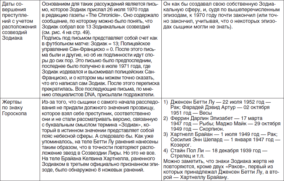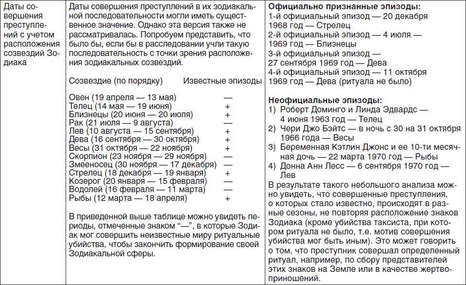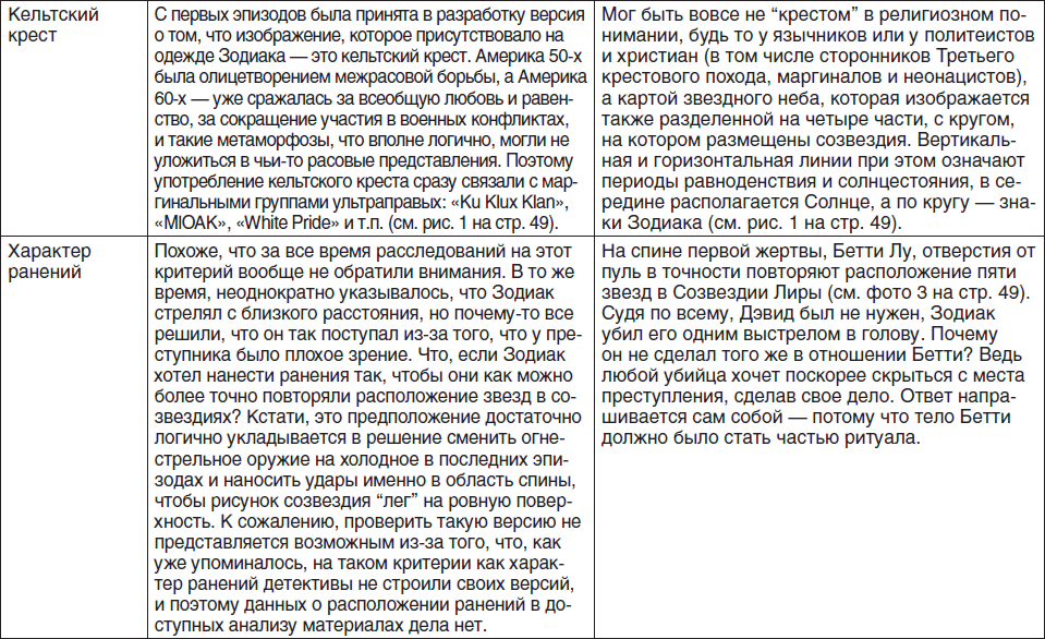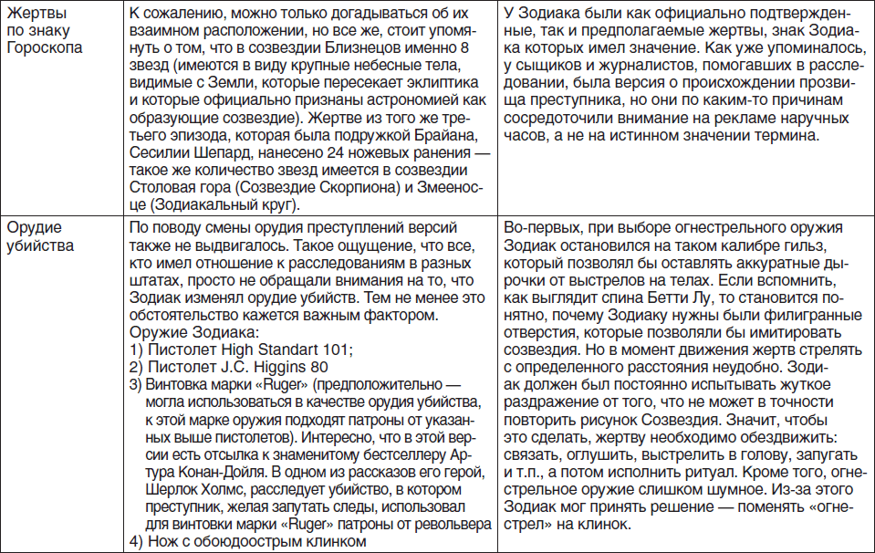 В таблице, приведенной ниже, авторы приглашают читателей рассмотреть и вместе поразмышлять над несколькими интересными версиями, которые могли бы сформировать отдельные линии расследования и войти в профиль Зодиака.