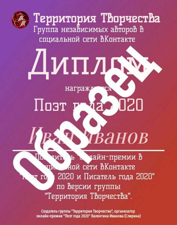 2. Победитель в номинации «Книга» получает памятный диплом с логотипом группы и премии образца «Книга года 2020 по версии группы Территория Творчества» и обговаривают условия создания и публикации бесплатной электронной книги.