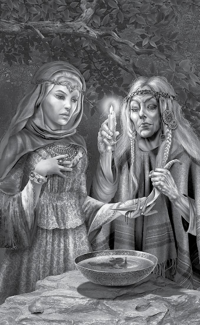 Две женщины, старая и молодая, склонились над чашей, поставленной на плоский камень под липой. Молодая укутана в широкий богатый плащ, на её шее, груди, запястьях позванивали, вспыхивая во тьме, украшения-обереги от злых чар. Старая распустила по плечам седые косы, стянув их лишь очельем на лбу. Ей бояться нечего — это её боялись. Она стояла, нагнувшись над чашей, наклонив мигающую свечу, роняя на воду капли воска.