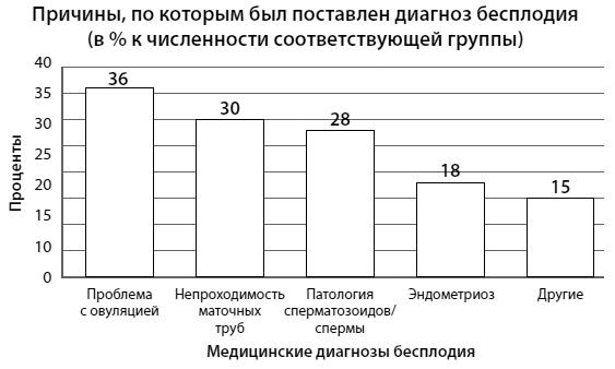 Врачи склонны видеть основными причинами бесплодия нарушения здоровья и считают эту группу самой значительной. Перинатальные психологи обоснованно полагают, что первичны причины первой группы и все расстройства здоровья носят психосоматический характер. В одном из исследований, посвященном причинам бесплодия, ученые пришли к выводу, что чаще всего психогенные факторы первичны. И в то же самое время они могут возникать как вторичные в процессе лечения бесплодия. (7.2) В свою очередь, доля идиопатического бесплодия в разных исследованиях оценивается как 10–30 % от всех случаев. (7.1, 7.3) Я чаще всего имею дело со смешанной формой бесплодия.