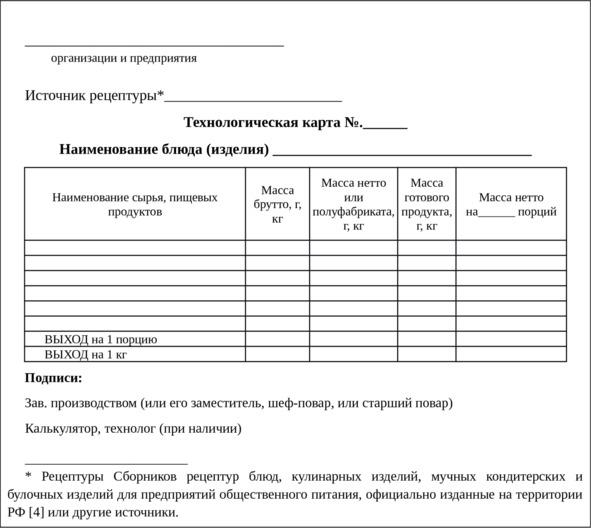 В том случае, если рецептуры нет в сборнике, то есть предприятие хочет продавать фирменное блюдо, приготовленное по собственной, свойственной только этому предприятию технологии, составляется Технико-технологическая карта. Эти карты составляются на каждое блюдо, кулинарное или кондитерское изделие. Унифицированной формы технологической карты нет, поэтому предприятию в любом случае необходимо разработать свою форму. Примерный образец технологической карты дан в таблице 1.1.