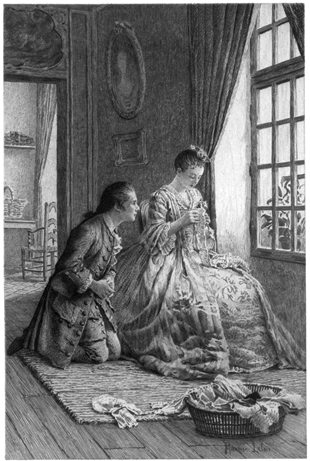Не знаю, чем кончилась бы эта оживленная, но немая сцена и сколько времени я оставался бы неподвижным в этом смешном и вместе с тем восхитительном положении, если бы нас не прервали. В тот самый момент, когда мой порыв достиг высшего напряжения, я услыхал, как в кухне, рядом с комнатой, в которой мы находились, отворилась дверь, и г-жа Базиль, обеспокоившись, быстро приказала мне словами и жестом: «Встаньте, идет Розина». Поспешно вставая, я схватил ее протянутую руку и запечатлел на ней два жарких поцелуя, почувствовав при втором поцелуе, что эта прелестная ручка слегка прижалась к моим губам. В жизни моей не было более сладкой минуты; но упущенный случай не повторился, и наша молодая любовь остановилась на этом.