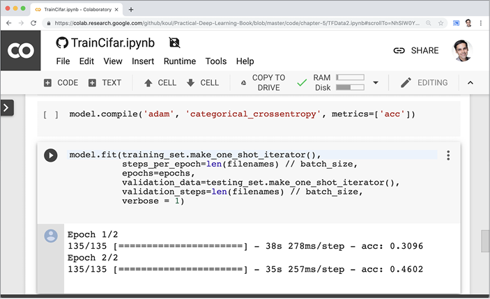 К счастью для вас, вы можете обойтись даже простым браузером. Сотрудники Google Colab (рис. 1.14) любезно согласились предоставить вычислительное время мощных графических процессоров бесплатно (до 12 часов за раз). Этого вполне достаточно, чтобы опробовать сценарии из нашего репозитория в GitHub. По мере совершенствования, когда начнете проводить больше экспериментов (особенно если будете заниматься этим профессионально или использовать большие датасеты), вы сможете получить доступ к графическому процессору, арендовав его в облаке (Microsoft Azure, Amazon Web Services, Google Cloud Platform и др.) или купив соответствующее оборудование. Но берегитесь счетов за электричество!