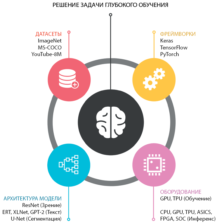 Вспомните раздел «Рецепт идеального решения задачи глубокого обучения» в главе 1, где говорилось, что нужны четыре ингредиента: оборудование, датасет, фреймворк и модель. Давайте посмотрим, какую роль играет каждый из них в этой главе.