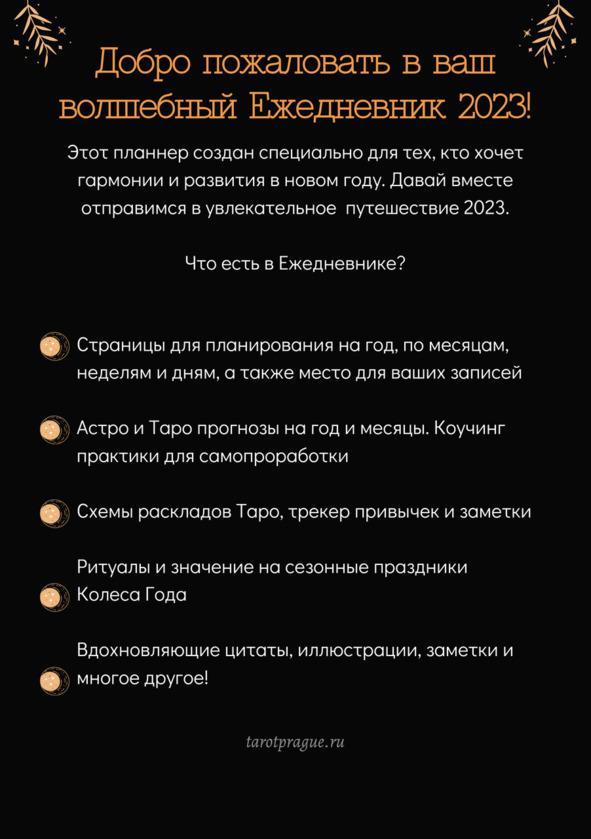 «Таро Ежедневник 2023» — универсальный планнер для тех, кто увлекается эзотерикой, Таро, самопознанием или планирует изучение. Здесь вы найдете астро прогноз на каждый месяц, Таро расклад на год и многое другое. И конечно, все необходимое для записи ваших дел и планов в течение года, схемы раскладов Таро, цели, подведение итогов, ритуалы по сезонам года.