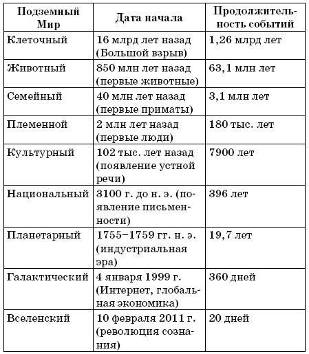 Ощущение ускорения времени может оказаться вовсе не игрой воображения. Все специалисты по культуре майя согласны с тем, что календарь майя указывает на систему Девяти Подземных Миров, которые разворачивались примерно 16,4 млрд лет и конец которых настанет в 2011 или 2012 году.