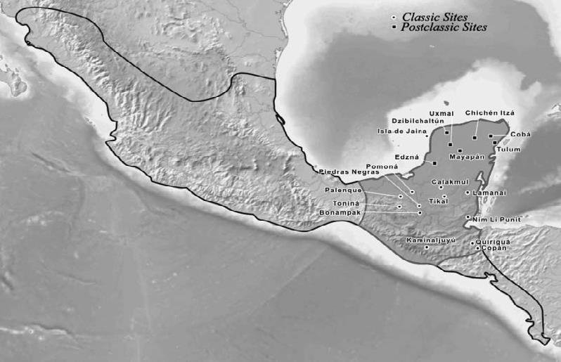 Рис. 1.1. Цивилизация майя была сосредоточена вокруг этих культурных центров и крупных городов. Опубликовано с любезного разрешения