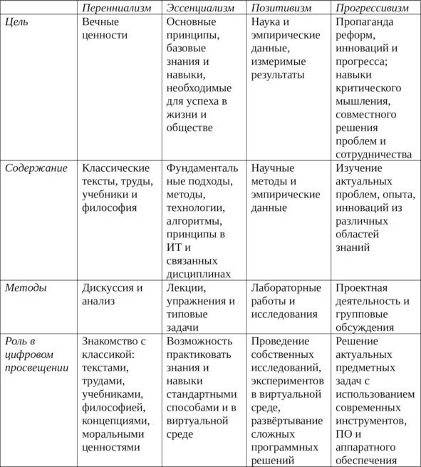 Мир ИТ-образования непрерывно эволюционирует, отражая тенденции и изменения в широком контексте методов и технологий. Перенниализм напоминает нам о ценности вечных истин в мире, где технологии стремительно меняются. Эссенциализм акцентирует внимание на фундаментальных знаниях, умениях и навыках, необходимых для понимания и использования новых методов и технологий. Позитивизм подчеркивает значимость научного подхода и получаемых через наблюдения и/или эксперименты эмпирических данных для разработки и непосредственного применения новых образовательных технологий. Прогрессивизм открывает двери к инновациям и адаптивному обучению, призывая к гибкости и готовности к изменениям, которые неизбежны в технологически насыщенном мире.