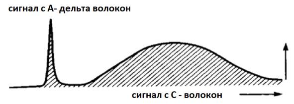 Ноцицептивный сигнал с А-дельта волокон вначале превышает по силе ноцицептивный сигнал с С — волокон. Но при длительной активации С- волокон, ноцицептивной сигнал по силе значительно превосходит первичный сигнал с А- дельта волокон.