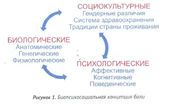 На данный момент принята «биопсихосоциальная модель» боли, в рамках которой боль рассматривается как результат динамического взаимодействия биологических, психологических, социальных и других факторов. Итогом такого взаимодействия будут индивидуальный характер болевого ощущения, форма реагирования пациента на боль и связанные с этим поведенческие особенности. В соответствии с этой моделью сложные формы поведения и даже простые физиологические реакции меняются в зависимости от индивидуальных (биологических и психологических) и средовых факторов. Принято считать, что существует тесная связь между субъективной интенсивностью боли и психологическим статусом человека. Такие факторы, как стресс, тревога, депрессия, пассивные стратегии преодоления боли, катастрофизация, производственные, семейные или социальные проблемы, нарушение сна, оказывают существенное влияние на переживание боли человеком. Персональная позиция и убеждения больного, его индивидуальные стратегии преодоления трудностей, а также его отношение к проводимому лечению влияют и на интенсивность боли, и на эффективность проводимой терапии.