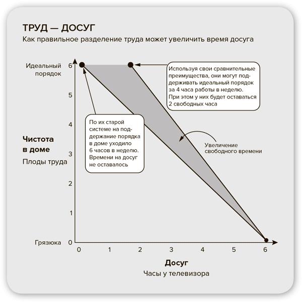 Но если бы они решили распределить дела, основываясь на сравнительных преимуществах, у них в доме царил бы идеальный порядок и при этом у них бы оставалось два часа на телевизор.