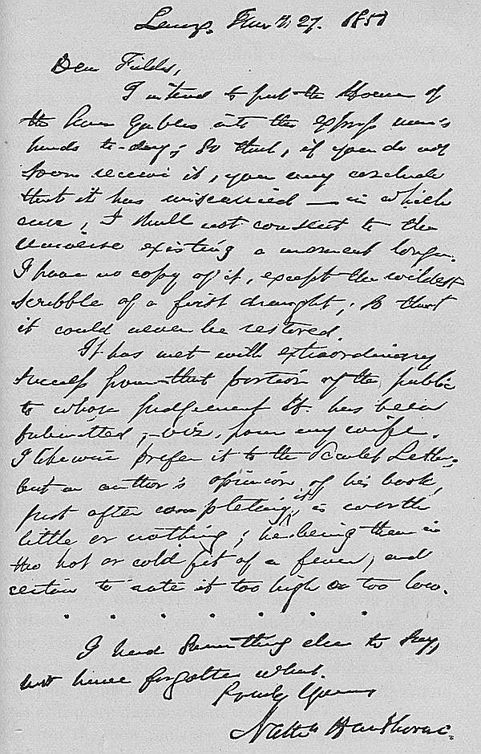 My dear Motley,—You are certainly that Gentle Reader for whom all my books were exclusively written. Nobody else (my wife excepted, who speaks so near me that I cannot tell her voice from my own) has ever said exactly what I love to hear. It is most satisfactory to be hit upon the raw, to be shot straight through the heart. It is not the quantity of your praise that I care so much about (though I gather it all up carefully, lavish as you are of it), but the kind, for you take the book precisely as I meant it; and if your note had come a few days sooner, I believe I would have printed it in a postscript which I have added to the second edition, because it explains better than I found possible to do the way in which my romance ought to be taken.... Now don't suppose that I fancy the book to be a tenth part as good as you say it is. You work out my imperfect efforts, and half make the book with your warm imagination, and see what I myself saw but could only hint at. Well, the romance is a success, even if it never finds another reader.