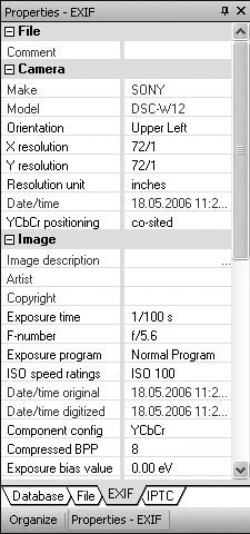 • Metadata (Метаданные). На этой панели отображается исчерпывающая информация о выделенном снимке, хранящаяся в JPEG-файле.