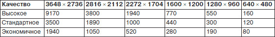 Таблица 1.1. Примерный объем файлов JPEG, Кбайт