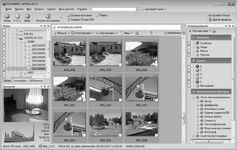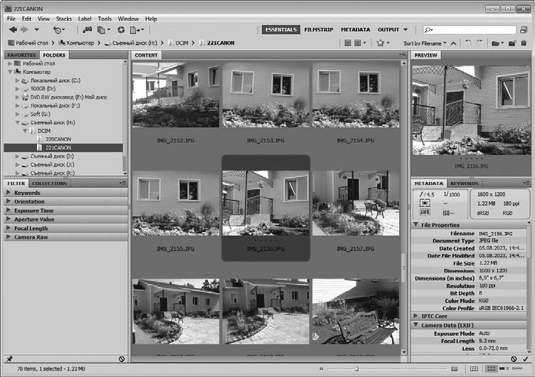 В основной части окна располагаются эскизы снимков, которые находятся в выделенном на панели Folders (Папки) каталоге (или на съемном носителе).