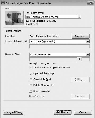 Программа Bridge имеет собственный инструмент импорта снимков с цифровой камеры. При выборе команды меню File → Get Photos from Camera (Файл → Получить снимки с камеры) появляется диалоговое окно Photo Downloader (Загрузчик снимков) (рис. 2.15).