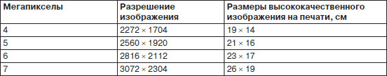 Таблица 3.1. Зависимость максимальных размеров выводимого на печать изображения от разрешения цифровой камеры