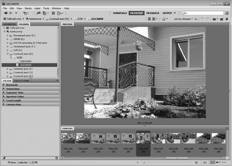 Интерфейс Bridge может быть представлен в нескольких конфигурациях. Если нажать кнопку Filmstrip (Диафильм) на панели инструментов программы, панель Preview (Просмотр) займет основную часть окна, а эскизы снимков будут располагаться лентой в нижней части (рис. 2.14).