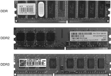 Во всех современных компьютерах используется так называемая динамическаяпамять, или DRAM (Dynamic RAM); подобное обозначение можно встретить в названиях некоторых параметров BIOS. Динамическая память бывает различных типов, но в последние годы применяются следующие.