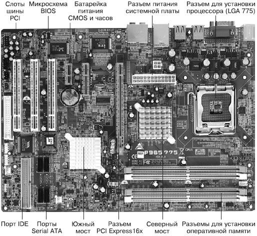 Наиболее важные компоненты компьютера располагаются на системной плате (рис. 1.2). Основа любой системной платы – чипсет, то есть набор микросхем, которые обеспечивают взаимодействие между процессором, памятью, накопителями и другими устройствами. В его состав входят два основных чипа, которые обычно называются северным(Northbridge) и южным(Southbridge) мостами.В чипсетах для процессоров Intel северный мост обозначается МСН (Memory Controller Hub), а южный – ICH (Input/Output Controller Hub).
