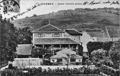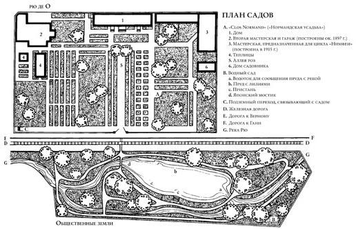 Вскоре Моне со своим многочисленным семейством обосновался в одном из самых просторных домов деревни — на старой ферме, известной под названием «Прессуар» («Яблочный пресс»). Последующие семь лет он арендовал это имение у Луи-Жозефа Сенжо — тот занимался коммерцией в Гваделупе. Дом был розовым с серыми ставнями, северной стороной он смотрел на рю де О, а южной — на обнесенный стеной яблоневый сад и огород. Художник вскоре перекрасил ставни в зеленый цвет, который в деревне почти сразу стали называть «зелень Моне»11. Свою мастерскую он устроил в амбаре с земляным полом, откуда можно было попасть прямо в дом. В 1890 году, через несколько дней после своего пятидесятилетия, он выкупил у Сенжо «Прессуар», а через пару лет присоединил к ферме соседний участок. И принялся выкапывать овощи и яблони, высаживая на их месте ирисы, тюльпаны и японские пионы. В северо-западной части имения Моне возвел двухэтажную постройку — один из гостей назвал ее «сельским павильоном»12 — и там, на верхнем этаже, обустроил еще одну мастерскую, освещавшуюся через высокий остекленный потолок. На нижнем этаже был вольер, где жили попугаи, черепахи и павлины, там же находились фотолаборатория и гараж с коллекцией авто.