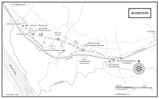 От Бернувиля до Живерни было около тридцати километров, но шофер наверняка преодолел это расстояние «с ветерком»: Клемансо любил быструю езду и обычно подгонял своих водителей, летя по ухабистым сельским дорогам со скоростью больше ста километров в час4. Частенько он отключал спидометр, чтобы не пугать пассажиров5. Можно представить, как автомобиль ворвался в крошечный городок Вернон, а затем, оказавшись на правом берегу Сены, повернул влево и направился к Живерни по шоссе, вдоль которого справа тянулись луга, а слева взмывал вверх крутой склон холма. Холм этот был изрыт белесыми прожилками каменоломен, где добывали песчаник, а между ними росли виноградники и производилось местное вино. Справа протекала речка Рю — неприметный ручей, где не так давно заезжий журналист с восхищением любовался прачками6. Тополя змейкой тянулись вдали через луга, на которых в мае вспыхивали россыпи маков, а по осени поднимались пшеничные скирды.
