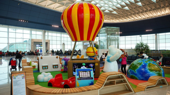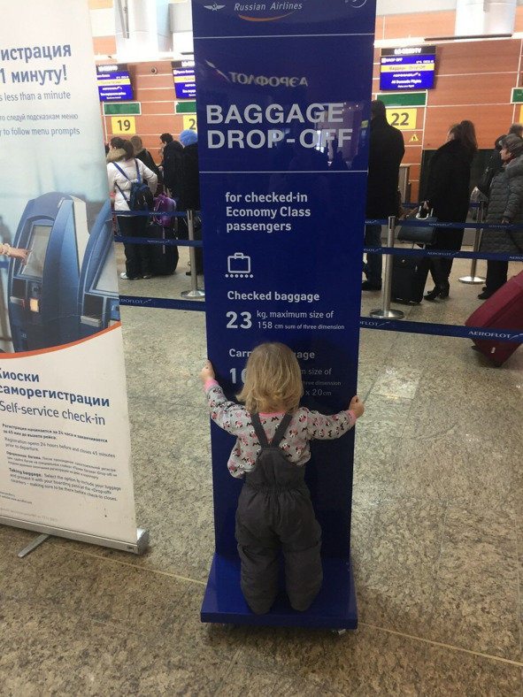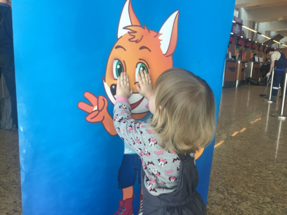 Нам предстояло провести 3 часа в ожидании открытия регистрации. Время пролетело довольно быстро. Доча не давала скучать. Бегала сломя голову по всему терминалу и знакомилась с детьми и взрослыми, а также с неодушевленными предметами.