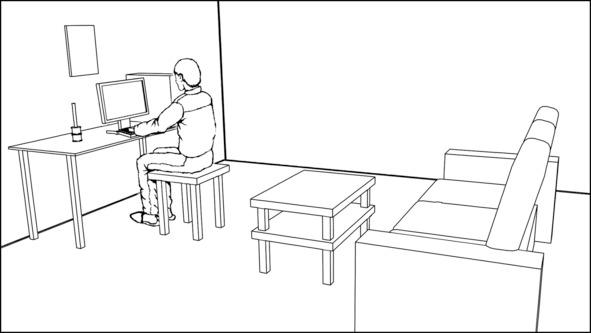 Workshop on the first floor of the house. On the walls hang reproductions of paintings, drawings and drawings by Leonardo da Vinci.