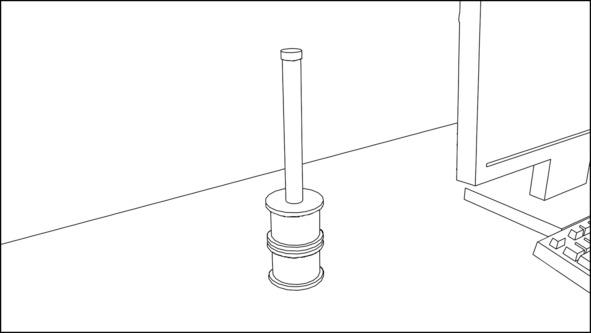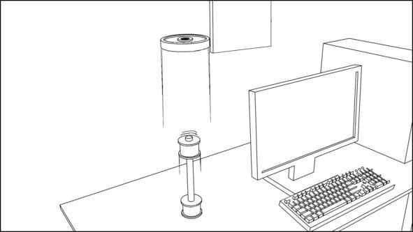 Fred shows the instrument on the table. On the table, one on top of the other, are two electromagnetic coils. The coils are put on a long rod with a stop in the upper part. The upper coil has the ability to move freely along the rod, up to the stop. Fred turns on the device.