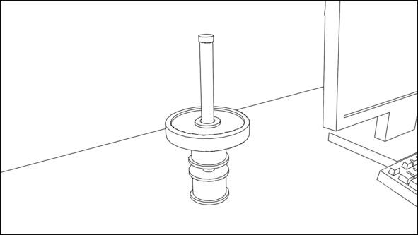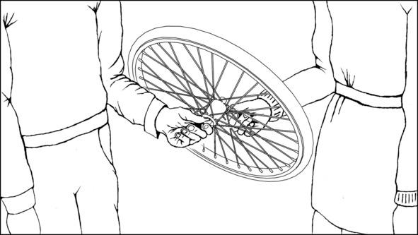 Mom gently removes the thumb. The axis remains to lie on his index finger. Fred raises his side of the axis. The end of the axis, lying on the mother’s index finger, rises up. The wheel rises, maintaining the horizontal position of the axis and the vertical position of the wheel itself.